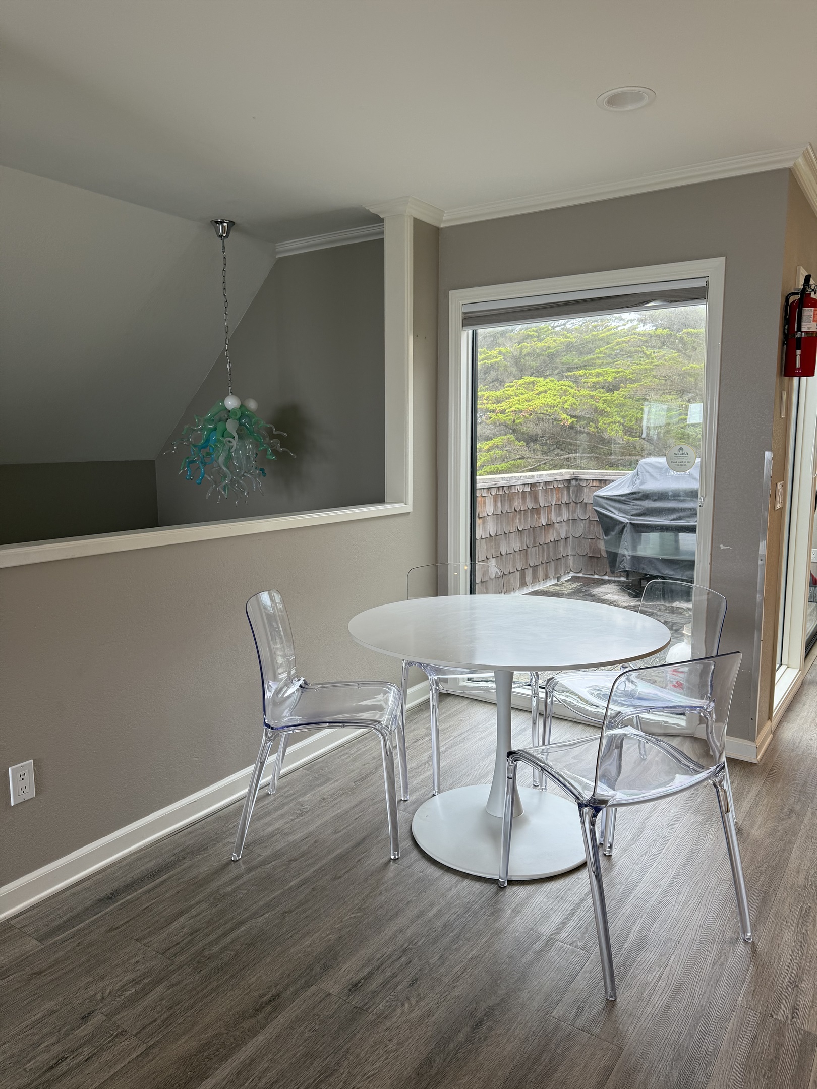 Gather on the top floor in an airy, open‑concept great room framed by floor‑to‑ceiling windows and sliding doors to an expansive ocean‑view deck—perfect for alfresco dining and grilling while waves roll in below. Mornings are magic: pull a shot on the espresso machine and sip your coffee as pelicans glide by and the bay wakes up.